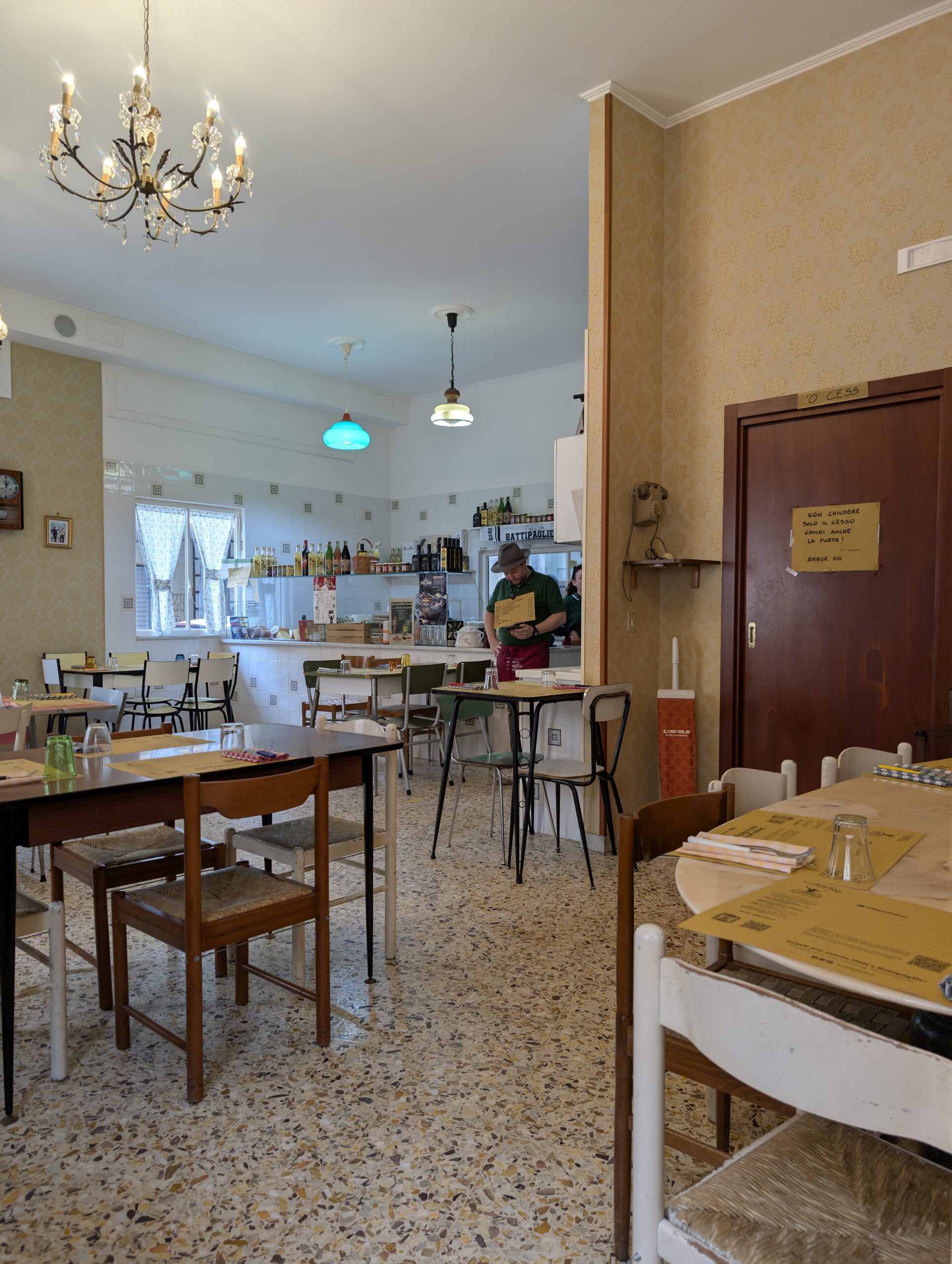 Il menu cambia ogni giorno, seguendo le stagioni e la disponibilità dei prodotti locali. Tra i piatti proposti potreste trovare la pasta e patate ripassata, la trippa, le polpette di pane e la pizza di gallette. Ogni pietanza è preparata con ingredienti semplici e genuini, proprio come facevano le nostre nonne. Un ospite soddisfatto ha commentato: "Sembra di stare a casa della nonna, tutto è curato nei minimi dettagli: dalla cucina ai lampadari, passando per i piatti e gli arredi."